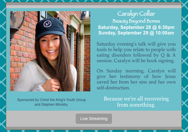 Caralyn, you did an excellent job in sharing your story. It’s evident you put your heart & soul in to it. Praise God that you choose recovery every day while doing God’s work. Your anorexia parallels my alcoholism. The isolation is the most dangerous place. I admire that you recognize how to protect your recovery by passing up fashion show tickets. I understand. Because if anything threatened my sobriety, its not even an option. Thanks again for sharing your heart with us. You are doing God’s work ❤️