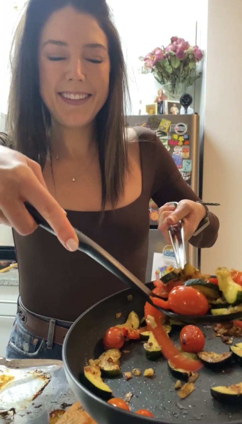 Also, saute your veggies. In a large nonstick pan, heat 3 Tbsp EVOO. Add your onion, salt and pepper, and cook for about 3 minutes, until it is beginning to become translucent. Then, add your other veggies and garlic and spices, and cook for about 8-9 minutes, until the veggies have softened and are cooked through.