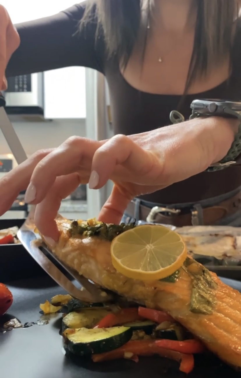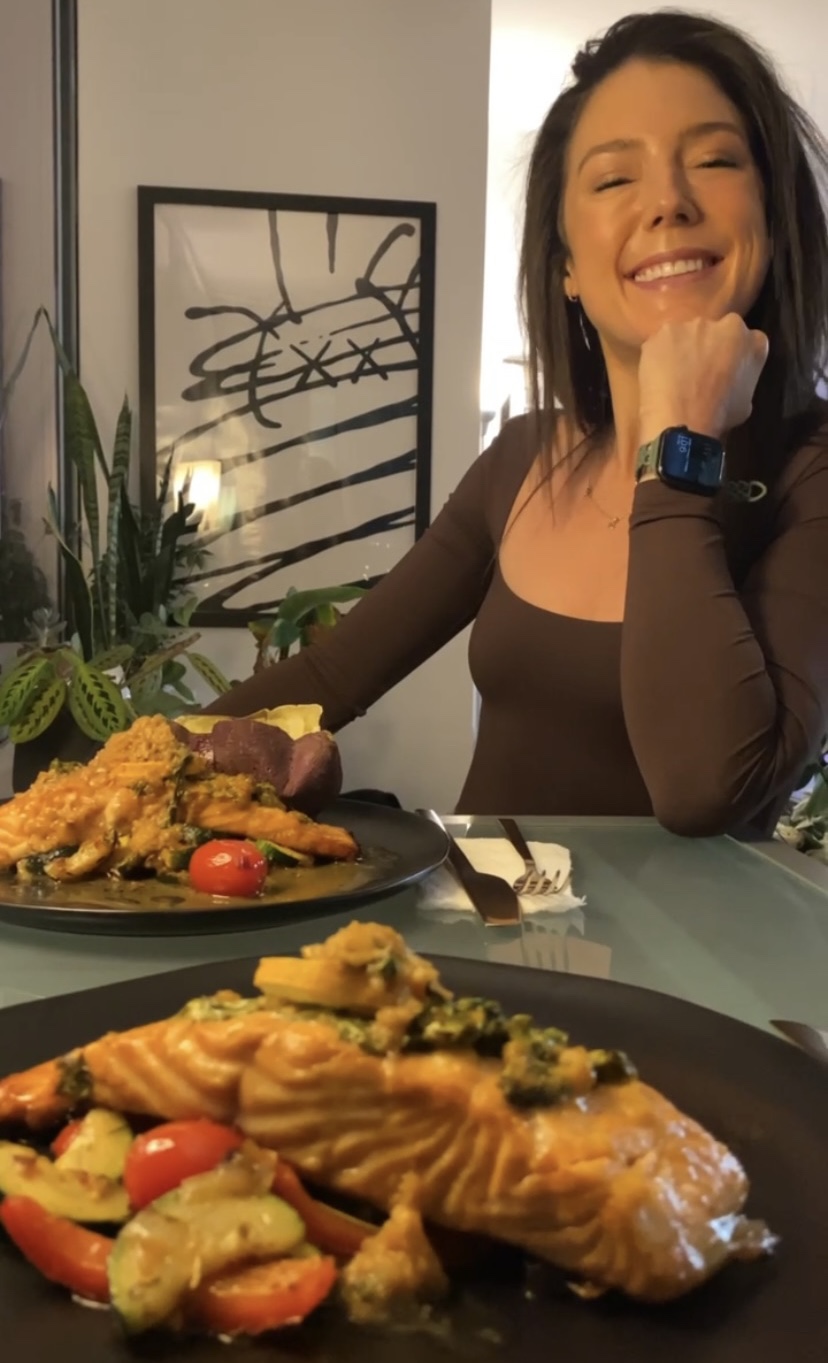To plate, place your salmon filet on a mound of the veggies. Top with a generous amount of the sauce. Serve with the sweet potato, or massaged kale (for my SCD’ers).